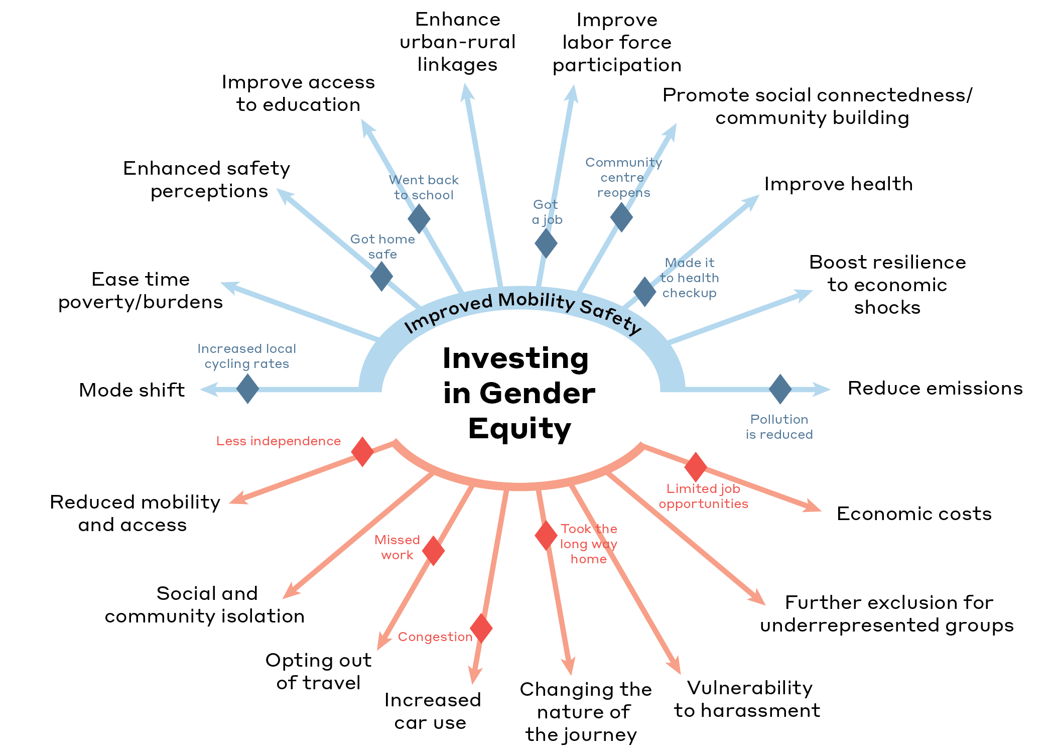 Interventions aimed at improving transport safety and perceptions of safety also benefit communities more broadly, improving conditions for everyone—including men—and serving as powerful catalysts for widespread social, economic and environmental benefits including improved performance of businesses and retail. Benefits are outlined in the graphic below:
